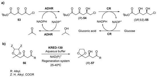 The efficacy of statins, inhibitors of the 3-hydroxy-3-methylglutaryl-coenzyme A (HMG-CoA) reductase, against all the forms of hypercholesterolemia and for the prevention of cardiovascular events [110] has been already mentioned in Section 2.1.3. In the last years, some patents employing ketoreductases have been published for the preparation of these compounds. Thus, in 2016 a patent was granted [198] describing the use of an engineered bacterium for the preparation of (3R,5S)-6-chloro-3,5-dihydroxyhexanoic acid tert-butyl ester (3R,5S)-55, a chiral precursor of statins. The engineered bacteria contained an ADH gene from Lactobacillus kefir DSM20587 (ADHR), a carbonyl reductase gene and a glucose dehydrogenase gene for the nicotinamide cofactor regeneration (Scheme 20a). The bacterial resting cells were employed in the bioreduction of 6-chloro-3,5-carbonyl hexanoate (53) in the presence of glucose and isopropanol in order to obtain the chiral diol (3R,5S)-55 with complete selectivity and high yields in a two-step procedure. In 2017, another patent was granted reporting the preparation of a set of statins using a chemoenzymatic methodology [199]. Thus, KRED-130, commercially available from Codexis, was able to reduce the keto group of the intermediate 56 to the corresponding chiral alcohol (R)-57 with quantitative yield and optical purities higher than 99.5% (Scheme 20b). A year later, a set of diketones intermediates in the preparation of statins were selectively reduced by different KREDs to the corresponding chiral 1,3-diols in a process carried out in buffer containing some organic solvents as ethanol, acetonitrile, toluene or hexane, among others [200]. Depending on the substrate structure, the chiral diols were obtained with yields around 90% and excellent optical purities after 24 h.