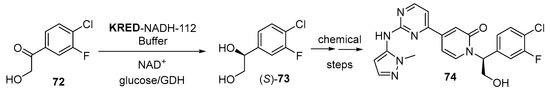 Alcohol dehydrogenases (ADHs; E.C. 1.1.1.x), also called ketoreductases (KREDs) or carbonyl reductases (CRs), are oxidoreductases that selectively catalyze the reversible conversion of carbonyl compounds into the corresponding alcohols, requiring the presence of nicotinamide cofactors (NADH or NADPH) to perform their activity. During the course of the reduction, the enzyme delivers a hydride from the cofactor C4 to the Si- (anti-Prelog ADHs) or to the Re-face (Prelog enzymes) of the carbonyl compound, yielding (R)- or (S)-alcohols, respectively [183,184,185,186,187]. Efficient cofactor regeneration methodologies are required due to the high costs of nicotinamides and inhibition processes. Thus, the biocatalyzed reduction is coupled with a secondary reaction to regenerate the nicotinamide cofactors [188,189,190]. In general, a second enzymatic reaction is employed, for example by combining glucose with glucose dehydrogenase (GDH), glucose-6-phosphate with glucose-6-phosphate dehydrogenase (G6PDH) or sodium formate with formate dehydrogenase (FDH). NAD(P)H can also be regenerated by using a coupled substrate approach, in which the ADH catalysed the desired bioreduction and the oxidation of a cosubstrate, in general isopropanol (IPA), which is oxidized to acetone. Ketone reduction is under thermodynamic control, so that a large excess of IPA is required. Over the last five years, several procedures describing the use of KREDs for the preparation of valuable compounds have been patented.