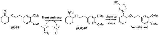 A patent covering a multistep synthesis of a set of β-3-antagonists [208] with a pyrrolidine core 65 [209] (Scheme 23) has been granted in 2017 to Merck Sharp & Dohme Corp. [210]. One of these steps comprises the use of four engineered KREDs, whose sequence is given, for the bioreduction of a set of α-aminoketones 63 to the corresponding β-aminoalcohols 64 in a dynamic kinetic resolution (Scheme 23) [211], leading to the stereoselective preparation of one of the diastereomers of the final alcohol with excellent yields and optical purities. Reactions were performed in presence of several cosolvents, whereas different enzymatic systems were tested for the nicotinamide cofactor recycling.