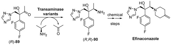 Hydrolases (Enzyme Commission number EC 3,) undeniably represent the most valuable type of enzymes in applied biocatalysis, due to their unique properties, such as broad substrate specificity, commercial availability, lack of need to use any cofactor, and high capability to work at high substrate concentrations [65,66,67,68,69,70,71,72,73]. Inside this group of enzymes, lipases (EC 3.1.1.3) can be considered the most useful, according to the ample number of processes in which they have been employed at lab [74,75,76,77] and industrial scale [78,79,80,81,82], mainly because they can perform with notable precision (chemo-, regio- and/or stereoselectivity) not only in their natural environment (aqueous solutions) but also in non-conventional media [66,75,79,82,83,84,85], therefore being catalogued as natural promiscuous enzymes [86]. Although the main industrial uses of lipases are in the detergent and food and beverage areas, there are plenty of examples in which these enzymes are employed in asymmetric synthesis [63]; in this sense, examples taken from granted patents in the last five years are hereunder presented.