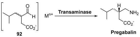 Using nitrilases, other patents cover the asymmetric synthesis of β-alanine from β-aminopropionitrile at high substrate loadings (> 200 g L−1) [168], an improved process for the production of pregabalin (see Scheme 34, below), the active agent in Lyrica®, a drug employed in the treatment of epilepsy, neuropathic pain and fibromyalgia [169,170] starting from dinitrile substrates (developed by Hikal Ltd) [171,172], or the production of 1-cyancyclohexylacetic acid by means of engineered nitrilases, and starting from the dinitrile substrate as well [173]. In another example, the synthesis of (R)-46, a precursor of ivabradine (Corlanor®, Procoralan®, Coralan®, Corlentor®, Lancora® or Coraxan®, a drug prescribed for the symptomatic management of stable heart-related chest pain and heart failure [174,175]) has been developed and patented by Servier [176] (granted in 2015), using a nitrilase to generate the chirality through hydrolysis of the racemic nitrile (R,S)-45 to furnish the carboxylic acid (R)-46, as depicted in Scheme 18.