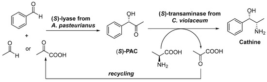 - Sehl, T.; Hailes, H.C.; Ward, J.M.; Wardenga, R.; von Lieres, E.; Offermann, H.; Westphal, R.; Pohl, M.; Rother, D. Two steps in one pot: Enzyme cascade for the synthesis of nor(pseudo)ephedrine from inexpensive starting materials. Angew. Chem. Int. Ed. 2013, 52, 6772–6775. [Google Scholar] [CrossRef] [PubMed]