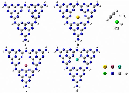 The optimized structures of acetylene (C2H2), hydrogen chloride (HCl), graphite carbon nitride (g-C3N4) (a), Au1/g-C3N4 (b), Pd1/g-C3N4 (c), and Ru1/g-C3N4 (d).