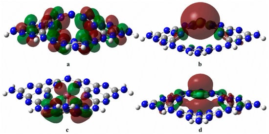Frontier molecular orbitals of HOMO for g-C3N4 (a), Au1/g-C3N4 (b), Pd1/g-C3N4 (c), and Ru1/g-C3N4 (d).