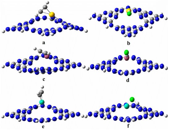 The stable adsorption configurations of Au1/g-C3N4·C2H2 (a), Au1/g-C3N4·HCl (b), Pd1/g-C3N4·C2H2 (c), Pd1/g-C3N4·HCl (d), Ru1/g-C3N4·C2H2 (e), and Ru1/g-C3N4·HCl (f).