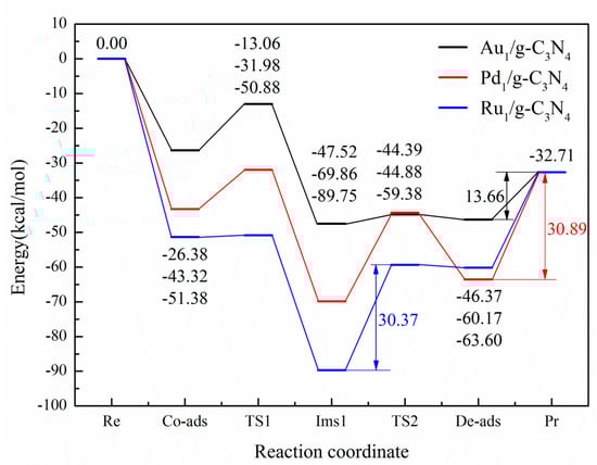 The energy diagrams of the most favorable pathways of acetylene hydrochlorination on Au1/g-C3N4, Pd1/g-C3N4, and Ru1/g-C3N4: Reactants (Re), co-adsorbed reactants (co-ads), transition states (TS), intermediate (Ims), desorption products (De-ads), and products (Pr). The data are zero-point-energy (ZPE) in kcal/mol.