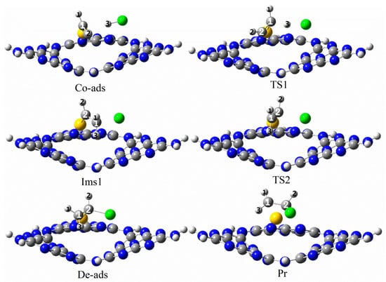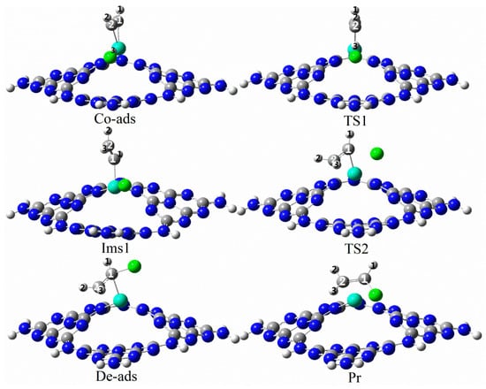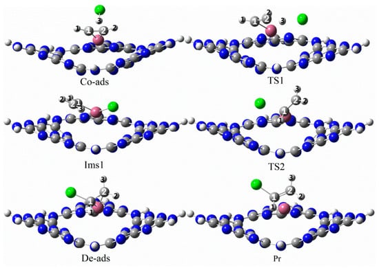 As the adsorption of C2H2 was shown to be better than that of HCl, C2H2 adsorbed on Au1/g-C3N4 to form Au1/g-C3N4·C2H2 first, followed by adsorption of HCl on Au1/g-C3N4·C2H2 to form a co-adsorption state (Co-ads). The co-adsorption energy ECo-ads is −26.38 kcal/mol. As it can be seen in Figure 5, the C2H2 molecule has undergone an obvious topographic change, in the co-adsorption structure, indicating strong adsorption of this compound. The adsorbed HCl is located roughly in the middle of the C1–C2 bond and is nearly perpendicular to it. Considering the change in the C3–Cl bond length was less than 0.1 Å, the HCl molecule was not activated. The co-adsorption structure can be transformed into intermediate state 1 (Ims1) through a transition state 1 (TS1). The H3–Cl bond breaks in the TS1 state, and the bond length increases from 1.31 Å to 1.58 Å. Meanwhile, the H3 atom is in close proximity to the C1 atom, and the distance of H3–C1 decreases from 2.19 Å to 1.37 Å, proving that the HCl molecule is completely dissociated and activated.