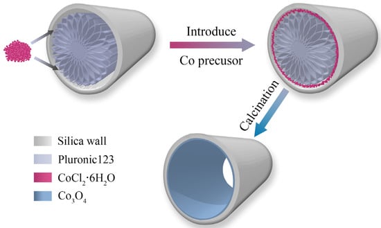 As one of the common transition metal oxides, cobalt oxide (Co3O4) also has Fenton-like catalytic property due to its variable valence state and redox capability [17]. In the reaction system, with coexisting Co species and H2O2, free radicals (·OH) are generated, thereby achieving the catalytic degradation of organic dye molecules, based on its strong oxidizing property [18]. Traditional impregnation is the most popular method to introduce Co species into mesoporous SiO2. However, the Co species could not easily enter the mesopores and they tend to form oxide clusters on the outer surface of the mesoporous SiO2, through impregnation [19]. This method could also lead to a partial structure collapse of the mesoporous material, resulting in a decreased catalytic performance [20]. Consequently, introducing the Co species into the pores of mesoporous SiO2, without destroying the structural regularity of the material, remains a challenge in catalyst fabrication science.