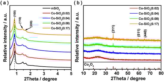 Low (a) and wide (b) angle XRD patterns of the mesoporous Co–SiO2(x) catalysts.