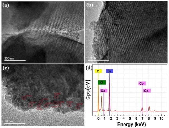 High resolution TEM (a,b), TEM of the sample exposed at prolonged electron beam (c) and EDS results (d) of the mesoporous Co-SiO2 (0.17) catalyst.