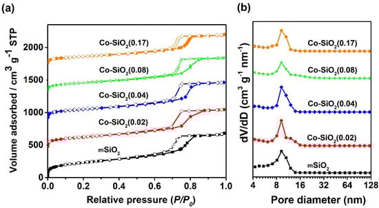 Figure 5 shows the N2 adsorption–desorption isotherms and pore size distributions (PSDs) of the Co–SiO2 catalysts. The isotherms of all catalysts were of IV shape with H1-type hysteresis loops, indicating a regularly ordered straight channel similar to that of the conventional mesoporous SiO2. The hysteresis loops of the Co–SiO2 catalyst did not change remarkably, whereas the amount of adsorbed N2 decreased slightly, following the increased Co content (Figure 5a). This result indicated that introducing the Co species via the spontaneous route had a negligible effect on the regularity of mesoporous channels [24]. PSD of the Co–SiO2 catalysts was relatively narrow, as shown in Figure 5b. From Table 1, the specific surface area of the mesoporous Co–SiO2 (586–444 m2∙g−1) was smaller than that of the support mSiO2 (840 m2∙g−1), which could be attributed to the larger atomic weight of Co than that of Si [25]. The pore volume of the Co–SiO2 (0.02) catalyst with less Co content was the same as that of the support. When the Co content increased, the pore volume of other Co–SiO2 catalysts gradually decreased. Meanwhile, the primary pore size of all Co–SiO2 catalysts was slightly smaller (9.23 nm) than that of the support (9.25 nm), but no remarkable changes were observed with an increase in the Co content. This result could be attributed to the existing states of Co in the catalysts. UV–Vis DRS and FTIR spectra could provide additional information on the chemical environment and the coordination nature of the Co species in the SiO2 matrix [26].