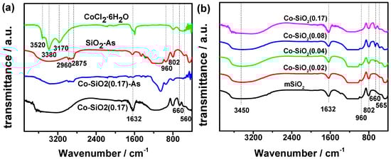 FTIR spectra of the mesoporous Co–SiO2 catalysts and their precursors were thoroughly investigated to provide additional information on the interactions between the Co species and mSiO2 support (Figure 6). Pristine CoCl2·6H2O showed characteristic bands at 3520, 3380, and 3170 cm−1, which were ascribed to the absorption of CoCl2. The adsorption peak at around 1630 cm−1 was assigned to the stretching vibration of H2O molecules, and bands below 1,000 cm−1 belonged to the fine structures of CoCl2 [31,32] (Figure 6a). The absorption band that appeared near 802 cm−1 corresponded to the stretching vibration of Si–O–Si in the uncalcined sample SiO2–As [33], and the characteristic band near 960 cm−1 was attributed to the isolated silanol groups (Si–OH) [34]. The absorption bands appeared at around 2875–2960 cm−1 corresponding to the organic groups, such as -CH3, -CH2-, ≡C-H, which mainly emerged from the organic templates in the SiO2–As sample. After the CoCl2·6H2O and SiO2–As were ground, the absorption bands at 3520, 3380, and 3170 cm−1 of CoCl2·6H2O in the obtained Co–SiO2 (0.17)–As sample disappeared, indicating the strong interactions between CoCl2·6H2O and SiO2–As. After calcination, the characteristic absorption bands centered at 2875–2960 cm−1 of the organic template disappeared, whereas the peaks of Co–O appeared at 660 and 565 cm−1 [35] (Figure 6a). The intensities of such peaks were gradually enhanced due to the increasing Co content in the Co–SiO2 catalysts. The stretching vibration band at 802 cm−1 corresponding to Si–O–Si was unchanged, whereas the band of Si–OH at 960 cm−1 weakened and finally disappeared in the Co–SiO2 (0.17) sample (Figure 6b).