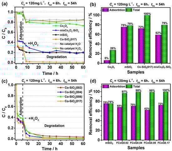 Figure 7 shows the adsorption and synergetic catalytic performance of different catalysts for removing the highly concentrated MB (120 mg·L−1) from aqueous solutions. For all catalysts, adsorption equilibrium was established within 6 h. The pristine mSiO2 exhibited the highest capacity (89 mg·g−1), whereas pure Co3O4 showed an inconspicuous MB adsorption capability (6 mg·g−1). The synthesized Co3O4 NP-functionalized mesoporous SiO2 (Co-SiO2 (0.17)) could adsorb 86.4 mg·g−1 MB, which was negligibly lower than that of mSiO2 but much higher than that of the simple mechanically mixed Co3O4 and mSiO2 (named as mixed Co3O4-SiO2) (Figure 7a). After adsorption, H2O2 was introduced into the system at 6 h to initiate the catalytic reaction. There was an instant decline of MB concentration in the catalyst-free system after the H2O2 addition, which was due to the solution dilution by the introduction of H2O2. After that, no more obvious change on the MB concentration was observed (Figure 7a), suggesting that the interaction between MB and H2O2 was negligible. A similar phenomenon was observed in the control catalyst-free experiment, in which H2O was added to the MB solution. The decrease of the MB concentration for the two catalyst-free systems with H2O and H2O2 addition was almost the same (Figure 7a). Mesoporous mSiO2 support did not exhibit a catalytic capability due to a lack of active sites. Pristine Co3O4 could degrade some MB molecules from the 120 mg·L−1 solution, but the total removal efficiency remained low (26%) due to its low adsorption capacity. The mixed Co3O4–SiO2 also had a passable catalytic performance and could remove 79% of MB from the solution. In contrast to the pristine Co3O4, mSiO2, and mixed Co3O4–SiO2, the Co–SiO2 (0.17) catalyst presented a remarkable catalytic capability and could completely remove MB from the solution (Figure 7b). This capability was attributed to the highly dispersed Co3O4 NPs on the mesoporous SiO2. Therefore, Co–SiO2 (0.17) showed a significantly better MB removal efficiency than that of the mechanically mixed sample.