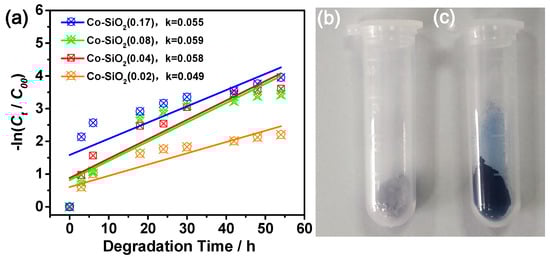 Kinetic curves of MB degraded by Co–SiO2 catalysts (a) and photograph of Co–SiO2 (0.17) catalyst before (b) and after (c) the catalytic experiment.