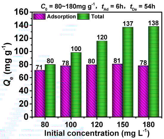 Figure 9 shows the adsorption/degradation of MB with different initial concentrations (C0, 80–180 mg·L−1) by the Co–SiO2 (0.17) catalyst. The adsorption amount of MB was 71 mg·g−1 at C0(MB) = 80 mg·L−1 and was maintained at 78–81 mg·L−1 at C0(MB) = 100–180 mg·L−1. However, the catalytic degradation amount of MB was enhanced when C0(MB) was increased from 80 mg·L−1 to 150 mg·L−1. The degradation amount of MB slightly increased when C0(MB) was further increased to 180 mg·L−1, indicating a weakened catalytic motivation in the highly concentrated MB solution.