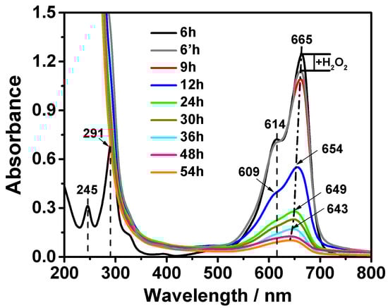 Figure 11 shows the UV–Vis spectra (200–800 nm) of the MB solution (120 mg∙L−1) degraded by the Co–SiO2 (0.17) catalyst, over time. H2O2 was added to the reaction system to initiate the catalytic degradation of MB after 6 h of adsorption. Two characteristic absorption peaks at 665 and 614 nm were attributed to the chromophore functional groups of MB monomers and dimers. The other two peaks at 291 and 245 nm were ascribed to the π–π* transitions related to unsaturated conjugated aromatic rings of MB [16]. The intensity of the absorption peak at 665 nm gradually decreased and shifted to the blue region (643 nm and lower wavelength), along with the reaction time variation from 6 h to 36 h (Figure 10). This finding could be attributed to the N-demethylation from MB [36]. The absorption peak at 614 nm also decayed and shifted to the blue regions (609 nm and lower). At 54 h of reaction time, the absorption peaks of MB weakened, indicating the degradation of most MB in the solution by the Co–SiO2 (0.17) catalyst. No new absorption peaks appeared during the reaction, suggesting that intermediate products that were difficult to degrade did not form in the system. The MB solution after catalytic degradation was centrifuged, and added to the clear Ca(OH)2 solution. It was observed that the Ca(OH)2 solution became a bit turbid, indicating the presence of CO2 in the solution in which MB was degraded, as shown in Figure S3.