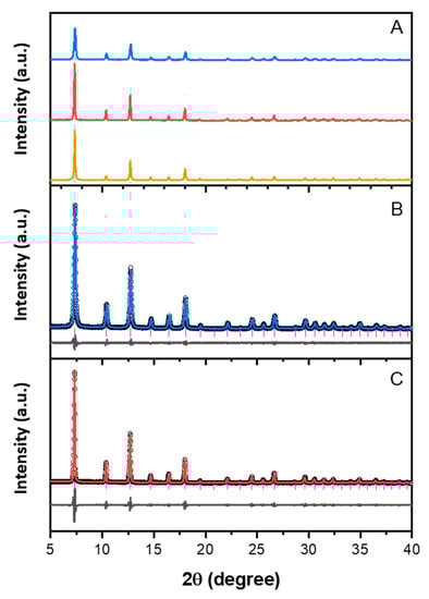 Powder XRD patterns were recorded on a X’Pert Pro MPD (Malvern Panalytical, Royston, UK), equipped with monochromatic Cu Kα1 radiation (λ = 1.54056 Å) and 2θ = 2–40° (step size 0.015° in 2θ), operated at 40 kV and 40 mA. Profile fitting of the powder patterns was performed using the GSAS software (UChicago Argonne LLC, IL, USA, 2010) [] implemented using the EXPGUI interface []. Nitrogen adsorption isotherms were collected in ASAP2020 (Micromeritics, Norcross, GA, USA) instrument at 77 K. All samples were degassed under vacuum at 120 °C for 8 h prior to measurements. Surface areas were calculated using the nitrogen adsorption between 0.001–0.2 p/p0 via the Brunauer–Emmett–Teller (BET) method. Fourier Transform Infrared (FTIR) spectra were measured at room temperature in the range 400−4000 cm−1 using a Platinum-ATR Bruker Alfa instrument (Bruker Optics GmbH, Fällanden, Switzerland). The stability of the catalysts was investigated by TGA using a TGA/DSC1 instrument (Mettler Toledo, Columbus, Ohio, OH, USA) under ambient air pressure and a heating rate of 10 °C·min−1. Samples were heated in air from 25 °C to 900 °C. Scanning electron microscopy (SEM) images of the catalysts were collected by a FEI SEM (FEI, Hillsboro, Oregon, OR, USA).