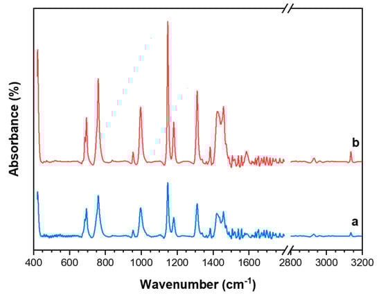 These crystal structures were further studied using FTIR spectroscopy. As shown in Figure 2, the spectra of both catalysts are in agreement with that of ZIF-8 in literature []. The peak at 422 cm−1 is the Zn–N stretch mode, which was observed at the beginning of the IR range available in our IR equipment. The majority of the absorption bands are associated with the vibrations of the imidazole units in the ZIF-8 framework. The bands below 800 cm−1 can be assigned as out-of-plane bending of the imidazole ring while those in the region of 900–1350 cm−1 are due to the in-plane bending. The bands between 1350 cm−1 and 1500 cm−1 can be assigned to the stretching of the entire ring, whereas the peak at 1584 cm−1 is due to the C=N stretch mode specifically. The bands at 2929 cm−1 and 3136 cm−1 are attributed to the aromatic and the aliphatic C–H stretch of the imidazole, respectively [].