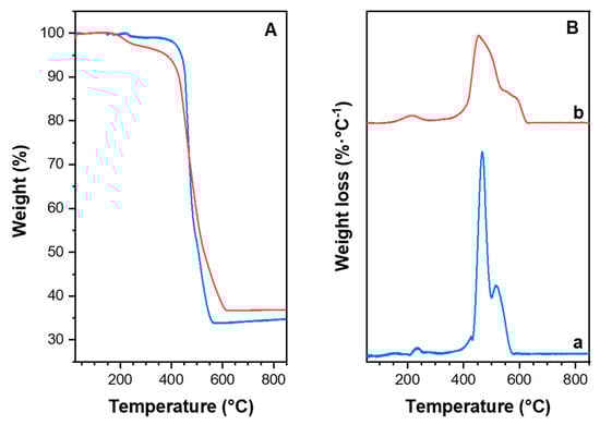 (A) Curves obtained from Thermal Gravimetric Analysis (TGA) measurements of ZIF-8 (blue line) and ZIF-8-HT (red line). (B) Weight loss curves from TGA measurements of (a) ZIF-8 and (b) ZIF-8-HT.