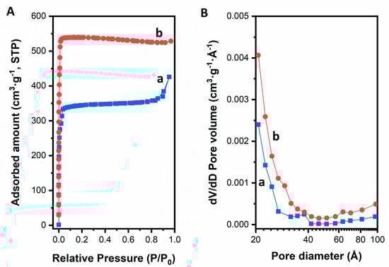 Nitrogen adsorption isotherms (A) and pore size distributions (B) of (a) ZIF-8 and (b) ZIF-8-HT measured at 77 K.