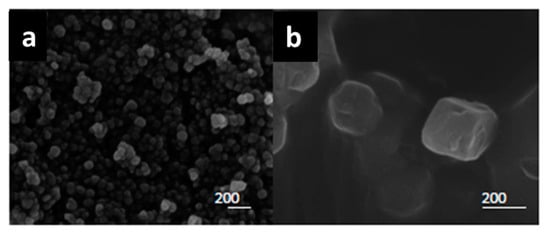 Scanning Electron Micrograph images of (a) ZIF-8 and (b) ZIF-8-HT. The scale bar represents 200 nm in each image.