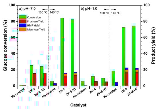 The ZIF-8 and ZIF-8-HT materials were tested as catalysts in the aqueous phase conversion of glucose for the production of HMF at 100 °C and 140 °C. The glucose conversion and yield of fructose, mannose, and HMF are tabulated in Table 3 and shown in Figure 6.