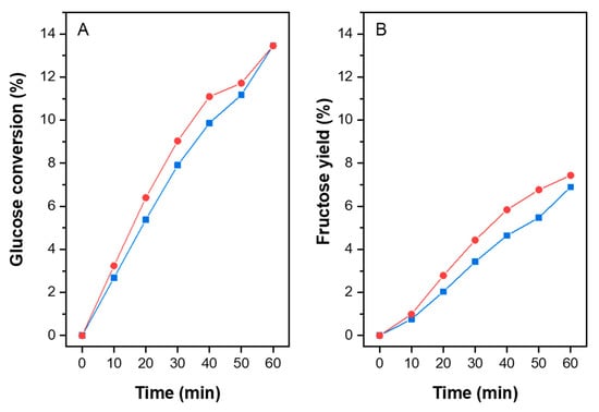The results of the catalytic activity tests at 100 °C, at pH 7.0, in batch reactors for ZIF-8 (square) and ZIF-8-HT (circle) showing glucose conversion (A) and fructose yield (B). Yields of mannose and HMF are close to zero and therefore not included.