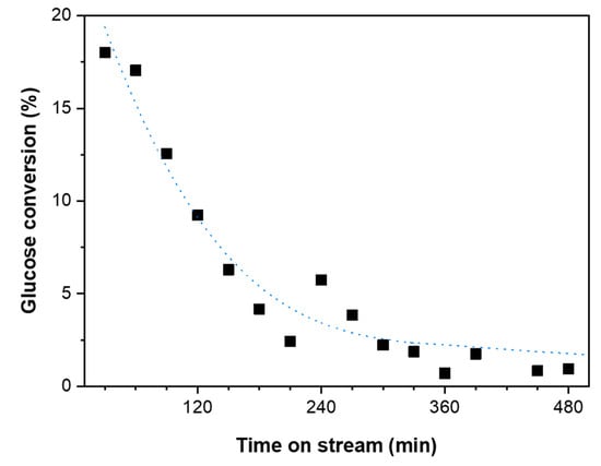 Catalytic screening was carried out in 4 mL batch reactors at 100 °C or 140 °C. 3 mL of 10 wt.% glucose solution was heated to the desired temperature together with the catalyst and a magnetic stirring bar (40 mg, corresponding to a 7.5 substrate to catalyst ratio, respectively) for 3 h. Blank experiments were also carried out without catalyst. The products were analysed by high performance liquid chromatography (HPLC) equipped with a Bio-Rad HPX 87P column (Shimadzu, Kyoto, Japan); a photo diode array detector and evaporative light scattering detector (ELSD) were used to monitor 5-HMF and sugars, respectively. The mobile phase was water with 0.6 mL·min−1 flow rate. The products and the reactant were quantified by calibration with external standards. The activity of catalysts under continuous flow was determined using a reactor system built in-house. An HPLC pump (Shimadzu LC-20AT, Kyoto, Japan) was used to pump the stock solution through a stainless steel tubular reactor (4.1 mm ID) which is capable of heating up to 400 °C, with a Eurotherm 3216 PID temperature controller (Schneider Electric, Rueil-Malmaison, France). At the exit of the reactor a Peltier module was used to cool the liquid leaving the reactor. Pressure within the system was controlled by a manual backpressure valve (Swagelok, Solon, Ohio, OH, USA) located downstream of the cooler. Sampling of the reaction mixture was achieved using a 10-port sample collection valve (Vici EUHA) which can be programmed for interval timing. Prior to each reaction, the catalyst were sieved (400 microns) and loaded to the reactor in between inert glass wool. At the inlet of the reactor, inert glass beads were packed to serve as preconditioning of the inlet flow. In a typical test, 80 mg of catalyst was pelletized and sieved to give a uniform particle size of ∼250 µm. The catalyst was then mixed an inert material (silicon carbide) and loaded into the reactor resulting in a bed length of 8 cm. A 10 wt.% glucose solution in water was then continuously pumped through the reactor at a flow rate of 0.14 mL/min resulting in a weight hourly space velocity of 10.5 h−1. Meanwhile, the reactor was heated to a desired reaction temperature. Samples were collected at the exit of the reactor every 30 min. The reaction solution collected in sample vials were analysed by HPLC as described above.