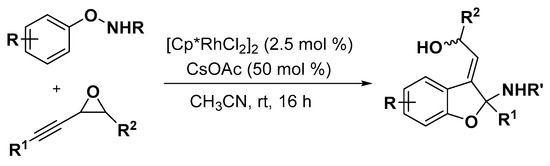 - Li, Y.; Shi, D.; Tang, Y.; He, X.; Xu, S. Rhodium(III)-catalyzed redox-neutral c-h activation/annulation of n-aryloxyacetamides with alkynyloxiranes: Synthesis of highly functionalized 2,3-dihydrobenzofurans. J. Org. Chem. 2018, 83, 9464–9470. [Google Scholar] [CrossRef] [PubMed]