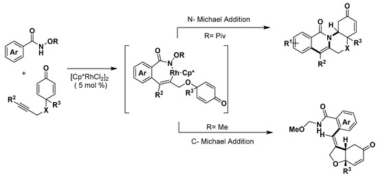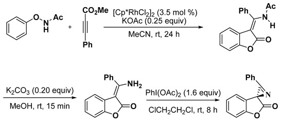 - Wu, Y.; Chen, Z.; Yang, Y.; Zhu, W.; Zhou, B. Rh(III)-catalyzed redox-neutral unsymmetrical C-Halkylation and amidation reactions of N-phenoxyacetamides. J. Am. Chem. Soc. 2018, 140, 42–45. [Google Scholar] [CrossRef] [PubMed]