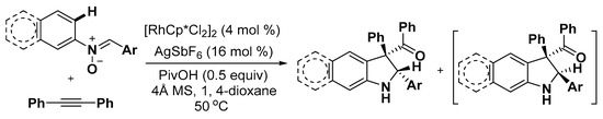 - Dateer, R.B.; Chang, S. Selective cyclization of arylnitrones to indolines under external oxidant-free conditions: Dual role of Rh(III) catalyst in the C–H activation and oxygen atom transfer. J. Am. Chem. Soc. 2015, 137, 4908–4911. [Google Scholar] [CrossRef] [PubMed]