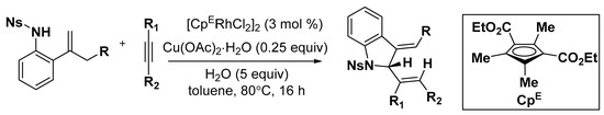 - Font, M.; Cendon, B.; Seoane, A.; Mascarenas, J.L.; Gulias, M. Rhodium(III)-catalyzed annulation of 2-alkenyl anilides with alkynes through C–H activation: Direct access to 2-substituted indolines. Angew. Chem. Int. Ed. 2018, 57, 8255–8259. [Google Scholar] [CrossRef] [PubMed]
