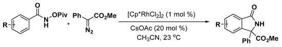 - Hyster, T.K.; Ruhl, K.E.; Rovis, T. A coupling of benzamides and donor/acceptor diazo compounds to form gamma-lactams via Rh(III)-catalyzed C–H activation. J. Am. Chem. Soc. 2013, 135, 5364–5367. [Google Scholar] [CrossRef] [PubMed]