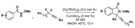 - Wang, C.Q.; Ye, L.; Feng, C.; Loh, T.P. C–F bond cleavage enabled redox-neutral [4 + 1] annulation via C–H bond activation. J. Am. Chem. Soc. 2017, 139, 1762–1765. [Google Scholar] [CrossRef] [PubMed]