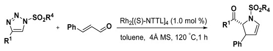 - Miura, T.; Tanaka, T.; Hiraga, K.; Stewart, S.G.; Murakami, M. Stereoselective synthesis of 2,3-dihydropyrroles from terminal alkynes, azides, and alpha,beta-unsaturated aldehydes via N-sulfonyl-1,2,3-triazoles. J. Am. Chem. Soc. 2013, 135, 13652–13655. [Google Scholar] [CrossRef] [PubMed]
