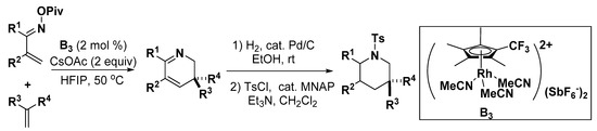 - Romanov-Michailidis, F.; Sedillo, K.F.; Neely, J.M.; Rovis, T. Expedient access to 2,3-dihydropyridines from unsaturated oximes by Rh(III)-catalyzed C–H activation. J. Am. Chem. Soc. 2015, 137, 8892–8895. [Google Scholar] [CrossRef]