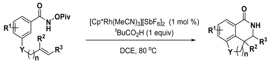 - Davis, T.A.; Hyster, T.K.; Rovis, T. Rhodium(III)-catalyzed intramolecular hydroarylation, amidoarylation, and Heck-type reaction: Three distinct pathways determined by an amide directing group. Angew. Chem. Int. Ed. 2013, 52, 14181–14185. [Google Scholar] [CrossRef] [PubMed]