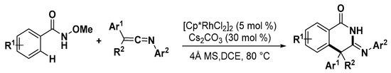 - Yang, X.; Liu, S.; Yu, S.; Kong, L.; Lan, Y.; Li, X. Redox-neutral access to isoquinolinones via Rhodium(III)-catalyzed annulations of O-pivaloyl oximes with ketenes. Org. Lett. 2018, 20, 2698–2701. [Google Scholar] [CrossRef]