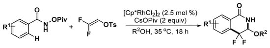 - Wu, J.Q.; Zhang, S.S.; Gao, H.; Qi, Z.; Zhou, C.J.; Ji, W.W.; Liu, Y.; Chen, Y.; Li, Q.; Li, X. Experimental and theoretical studies on rhodium-catalyzed coupling of benzamides with 2,2-difluorovinyl tosylate: Diverse synthesis of fluorinated heterocycles. J. Am. Chem. Soc. 2017, 139, 3537–3545. [Google Scholar] [CrossRef]