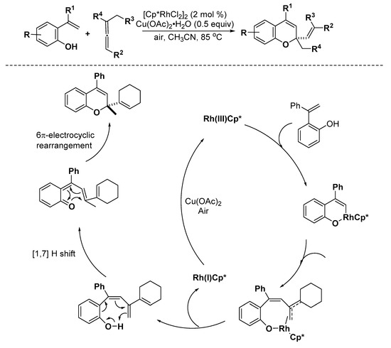 - Casanova, N.; Seoane, A.; Mascarenas, J.L.; Gulias, M. Rhodium-catalyzed (5 + 1) annulations between 2-alkenylphenols and allenes: A practical entry to 2,2-disubstituted 2H-chromenes. Angew. Chem. Int. Ed. 2015, 54, 2374–2377. [Google Scholar] [CrossRef] [PubMed]