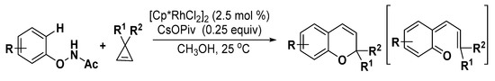 - Zhang, H.; Wang, K.; Wang, B.; Yi, H.; Hu, F.; Li, C.; Zhang, Y.; Wang, J. Rhodium(III)-catalyzed transannulation of cyclopropenes with N-phenoxyacetamides through C–H activation. Angew. Chem. Int. Ed. 2014, 53, 13234–13238. [Google Scholar] [CrossRef] [PubMed]