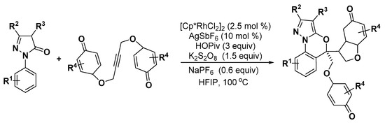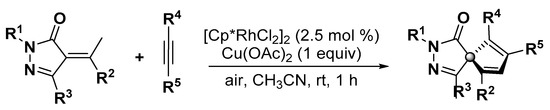 - Zheng, J.; Li, P.; Gu, M.; Lin, A.; Yao, H. Synthesis of spiropentadiene pyrazolones by Rh(III)-catalyzed formal sp3 C–H activation/annulation. Org. Lett. 2017, 19, 2829–2832. [Google Scholar] [CrossRef]