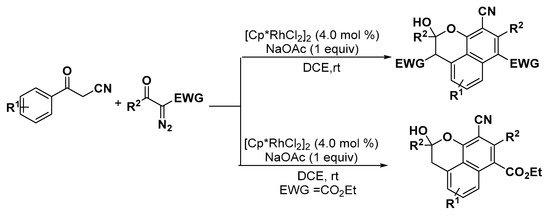 - Fang, F.; Zhang, C.; Zhou, C.; Li, Y.; Zhou, Y.; Liu, H. Rh(III)-catalyzed C–H activation of benzoylacetonitriles and tandem cyclization with diazo compounds to substituted benzo[de]chromenes. Org. Lett. 2018, 20, 1720–1724. [Google Scholar] [CrossRef] [PubMed]
