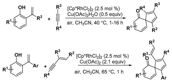 - Kujawa, S.; Best, D.; Burns, D.J.; Lam, H.W. Synthesis of spirocyclic enones by Rhodium-catalyzed dearomatizing oxidative annulation of 2-alkenylphenols with alkynes and enynes. Chem. Eru. J. 2014, 20, 8599–8602. [Google Scholar] [CrossRef] [PubMed]