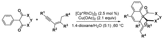 - Burns, D.J.; Best, D.; Wieczysty, M.D.; Lam, H.W. All-carbon [3 + 3] oxidative annulations of 1,3-enynes by Rhodium(III)-catalyzed C–H functionalization and 1,4-migration. Angew. Chem. Int. Ed. 2015, 54, 9958–9962. [Google Scholar] [CrossRef] [PubMed]