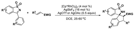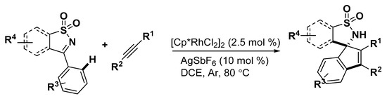 - Dong, L.; Qu, C.H.; Huang, J.R.; Zhang, W.; Zhang, Q.R.; Deng, J.G. Rhodium-catalyzed spirocyclic sultam synthesis by [3+2] annulation with cyclic N-sulfonyl ketimines and alkynes. Chem. Eur. J. 2013, 19, 16537–16540. [Google Scholar] [CrossRef] [PubMed]