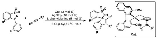 - Pham, M.V.; Cramer, N. Enantioselective access to spirocyclic sultams by chiral Cp(x) -Rhodium(III)-catalyzed annulations. Chem. Eur. J. 2016, 22, 2270–2273. [Google Scholar] [CrossRef] [PubMed]