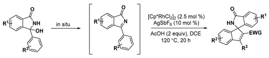 - Liu, B.; Hu, P.; Zhang, Y.; Li, Y.; Bai, D.; Li, X. Rh(III)-catalyzed diastereodivergent spiroannulation of cyclic imines with activated alkenes. Org. Lett. 2017, 19, 5402–5405. [Google Scholar] [CrossRef]