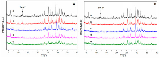 X-ray diffraction (XRD) patterns of the catalysts: (A) (a) Cs ion-exchanged X zeolite (CsX), (b) 0.08 Fe/CsX-I, (c) 0.15 Fe/CsX-I, (d) 0.30 Fe/CsX-I, (e) 0.50 Fe/CsX-I; (B) (a) CsX, (b) 0.08 Fe/CsX-II, (c) 0.15 Fe/CsX-II, (d) 0.30 Fe/CsX-II, (e) 0.50 Fe/CsX-II.