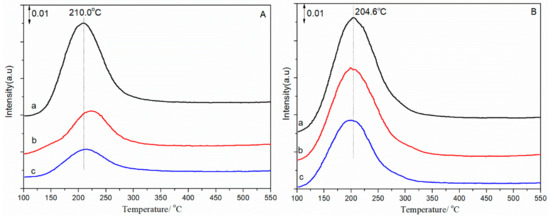 Profiles of (A) NH3 temperature programmed desorption (TPD) and (B) CO2-TPD for catalysts: (a) CsX, (b) 0.15 Fe/CsX-I, (c) 0.15 Fe/CsX-II.